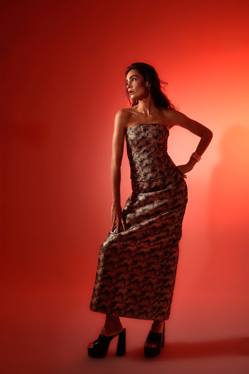 A Saia Eva possui um design elegante e atemporal em razão do seu caimento reto e comprimento longo. É feita em tecido encorpado de construção jacquard nos tons de preto e dourado. Possui cós de alfaiataria e fenda transpassada na parte traseira, garantindo maior conforto e mobilidade. A Saia Eva possui forro que garante um visual limpo e refinado à peça.