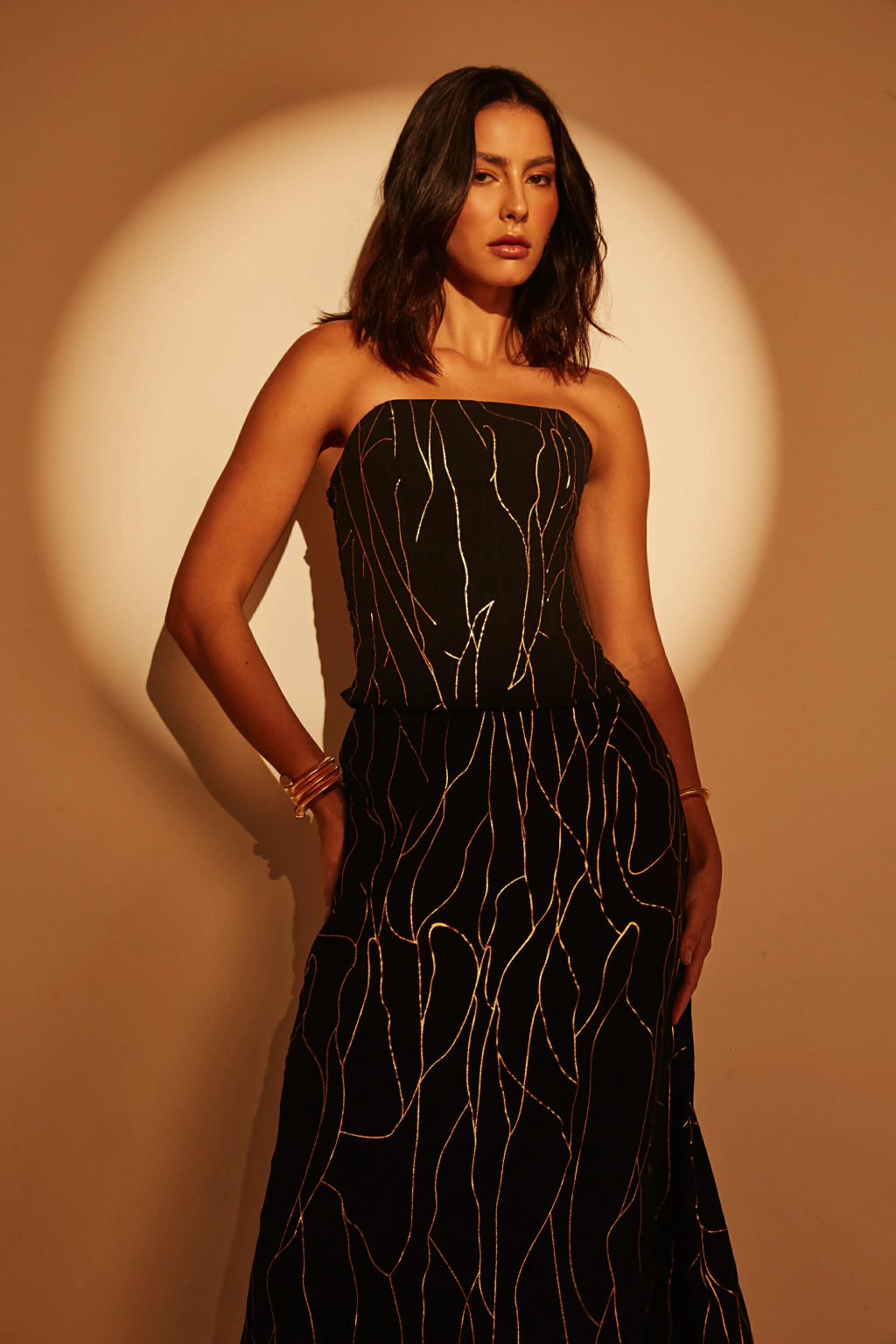 O destaque da peça é o tecido de base lisa na cor preta com aplicação desenhos orgânicos dourados que realçam o design e alongam visualmente a silhueta.
